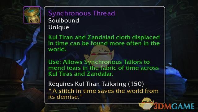 在世界各地可以找到更多布料来置换成库尔提拉斯和赞达拉布料。使用同步针线让裁缝可以修补库尔提拉斯和赞达拉的各个时间织物的裂缝。这个同步针线的效果描述的不是很清楚,大概意思应该是可以置换各个资料片中的布料,主动技能小编也没搞明白是干什么的。