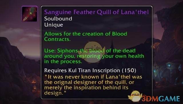 首先到各自主城(祖达萨或博拉勒斯)的铭文训练师那接任务。完成任务以后就可以获得兰娜瑟尔的血红羽毛笔。