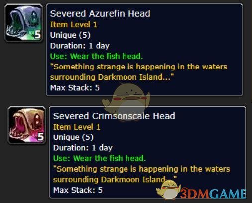 通过在暗月马戏团周围的水域钓鱼获得一种消耗品,大概需要30杆,使用后人物角色戴上一个“鱼头”,物品在背包里的持续时间为1天,鱼头效果持续60分钟。这个鱼头没有任何特殊的属性加成,但是能有这种逆天的外观就够了,还要啥自行车。