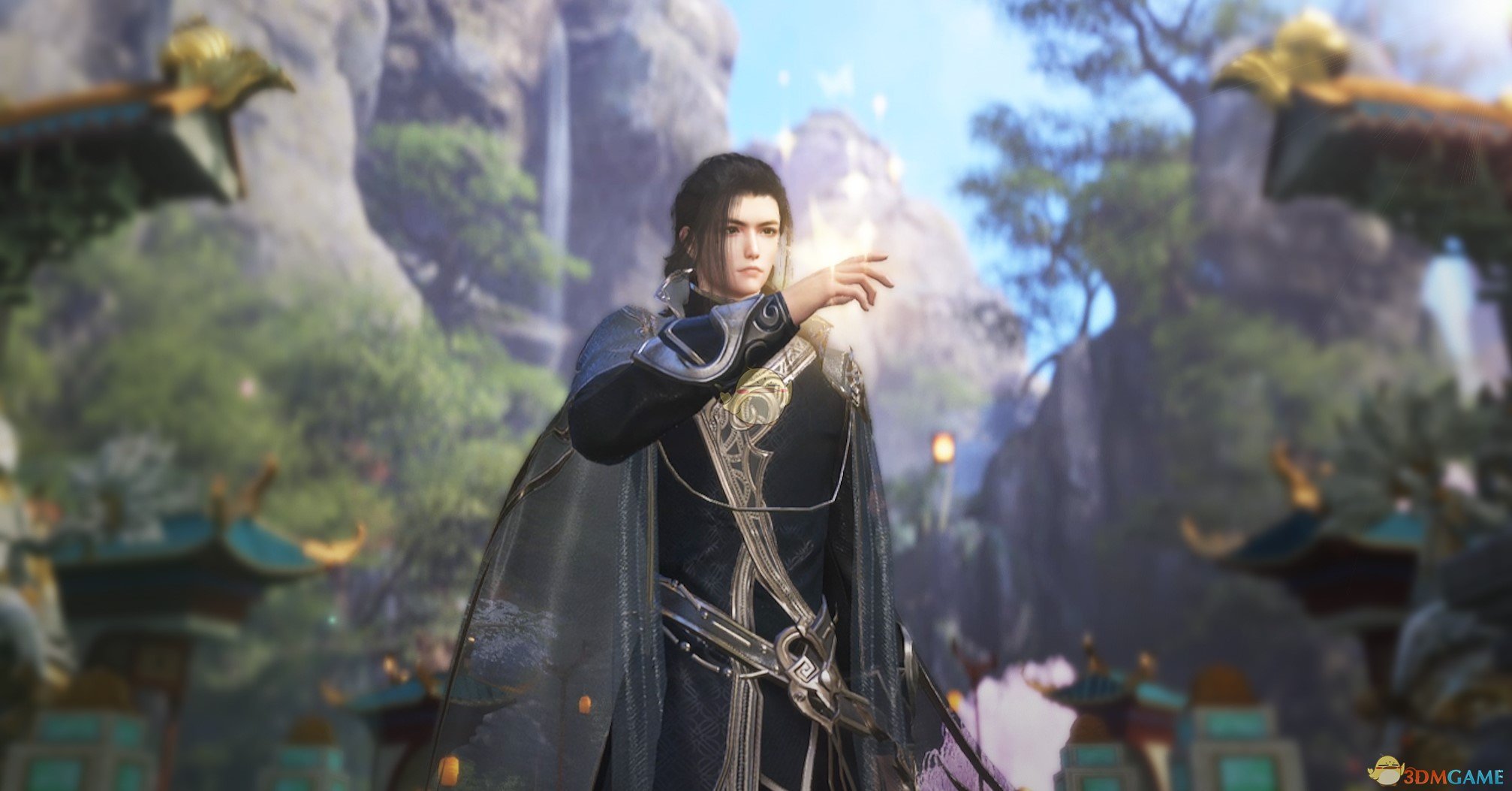 以“访云间·九叠云屏”为例,男款造型有磅礴不羁之气,发型随性飘逸,采用立领设计计,绸纱随长袖垂落,胸前双襟错落,腰束皮质腰带,长靴及膝,有干净利落之感。