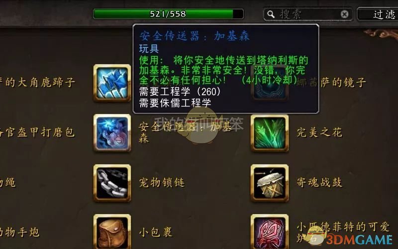 侏儒工程学的角色可以使用安全传送器:加基森玩具(4小时CD)传送到不远处的加基森。限制除了侏儒工程师以外,这个玩具还需要工程学达到260点。