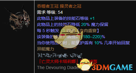 产生这个思路的原因是因为新的两个光环很吸引人,一个提供15%法术more伤以及产生奉献地面,一个20%more持续伤害以及持续时间加成。这么好的光环当然想全都要,但是这样的话魔力占用就成了问题。要解决这个问题,我的思路是用EB释放技能,把魔力全部用来开光环,然后用EB配合MOM来达到提高EHP的目的。