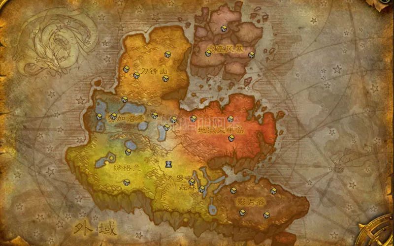 新的外域地图全开后可以看到风暴要塞、风暴尖塔、盘牙水库、地狱火堡垒、黑暗之门、沃舒古、沙塔斯、奥金顿和黑暗神殿。没开的外域地图上则只会显示黑暗之门。