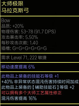 后缀 多大师有2个词缀空余,可以自行补充,因为弓上的后缀没有法术相关的了,我这里选用了16混沌伤害