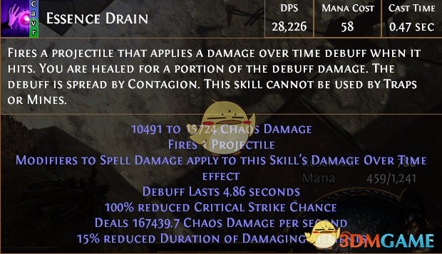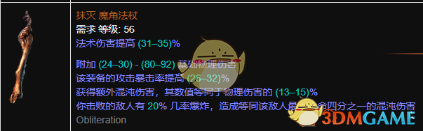 因为是混沌持续技能,而且混沌法术还有吃法术的特色,所以尽量寻找更多的法伤和持续伤以及混沌伤,而且3.5新加入了“非异常伤害的持续伤害加成”这个词缀,等同于是更多混沌伤害的词缀,非常强力,建议天赋装备上优先选取。词缀GGG已经重新定义了混沌持续伤害内容,范围伤害是无法加成给混沌持续法术的。所以集中效应是无法加成相关技能的持续伤害。