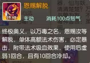 恩赐解脱:终极奥义,以万毒之名,恩赐汝等解脱,单体高额法术伤害,必定暴击,且附带法术吸血效果,使用后虚弱1回合,且有10回合冷却。