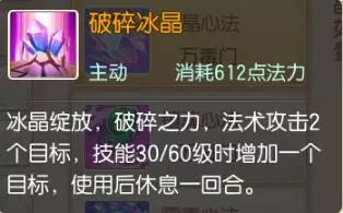 破碎冰晶:冰晶绽放,破碎之力,法术攻击2个目标,技能30/60级时增加一个目标,使用后休息一回合。