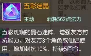 五彩迷晶:五彩斑斓的晶石迷阵,增强友方封抗能力,对队友3个角色或仙侣使用,增加双抗百分10,持续5回合。