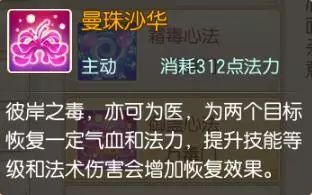 曼珠沙华:彼岸之毒,亦可成医,为两个目标恢复一定的气血和法力,提升技能等级和法术伤害会增加恢复效果。