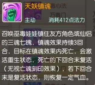 天妖镇魂:召唤巫毒娃娃镇住友方角色或仙侣的三魂七魄,镇魂效果持续3回合,目标在镇魂效果内死亡,会激活重生状态,死亡的下回合末复活。