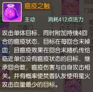 瘟疫之触:攻击单体目标,同时附加4回合的瘟疫状态,在目标每回合末掉血,且瘟疫效果每回合末随机传给临近单位没有瘟疫状态的目标,继承回合数,瘟疫的伤害与自身攻击相关。