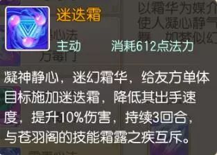 迷迭霜:凝神静心,迷幻霜华,给友方单体目标施加迷迭霜,降低其出手速度,提升10%伤害,持续3回合。