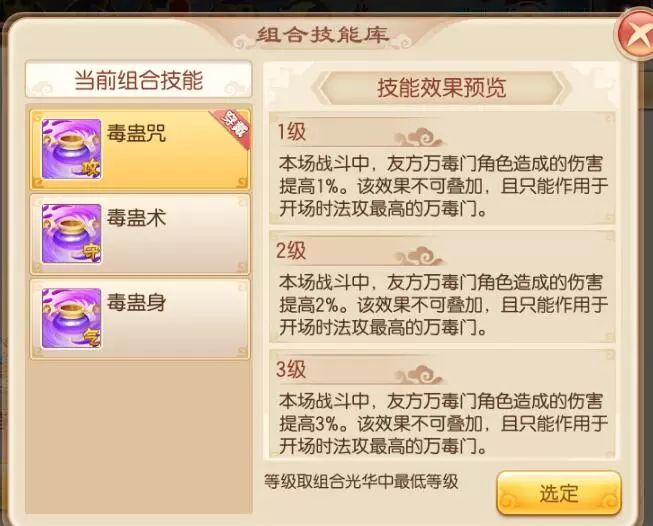 优先使用门派系光华技能—毒蛊咒、毒蛊术、毒蛊身,光华搭配财宝、飞羽、桃心。