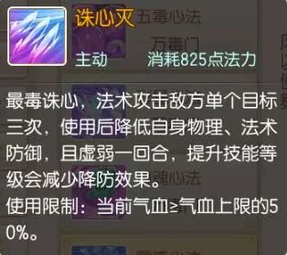 诛心灭:最毒诛心,法术攻击敌方单个目标三次,使用后降低自身的物理、法术防御,且虚弱一回合。