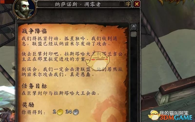 任务中说到,联盟已经从纳兹米尔发动对部落的进攻了,需要玩家们去巨擎封印找拉斯塔哈大王,需要注意的是,大王并没有在他的宝座上,而是在塔兰吉公主身边。