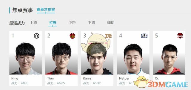 打野位置上,冠军打野Ning凭借68.8战力值拿下了打野位第一,紧随其后的是FPX打野Tian以及RNG打野Karsa。和上单位不同的是,打野位没有任何一位韩援,可以看出国产打野还是非常给力的。