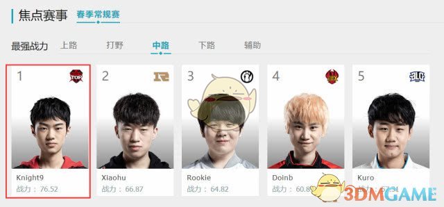 最后的中单位置可以说是本次战力榜的重头戏了,中单位置战力值最高的是TOP中单Knight9,也就是玩家们口中的“黄金左手”。从官方公布的战力值可以看出,Knight9的战力来到了76.92,碾压了所有的中单选手,比第二名的小虎高出了整整10点战力值。除此之外,Knight9也是本次战力榜中唯一一位战力值超过70的选手,可以看出Knight9真的是非常恐怖了。