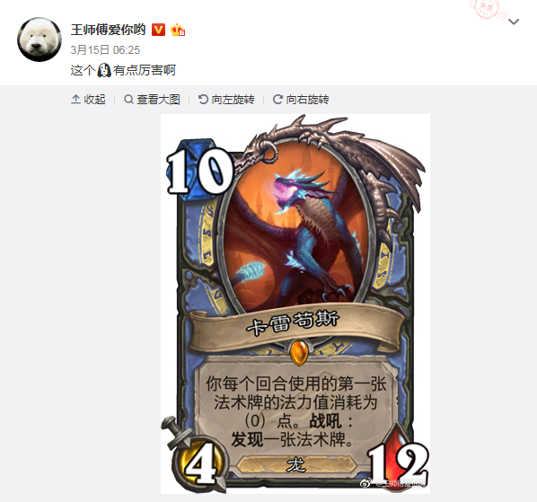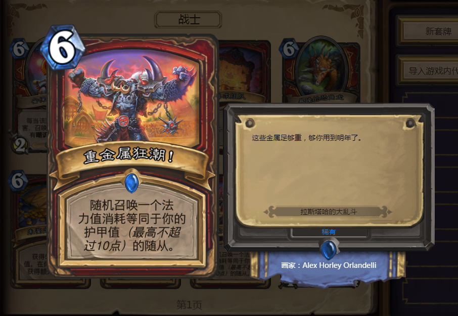 或者你觉得新版本之后法师的“卡雷苟斯”会烂大街,你也可以选择用战士搏一搏,说不定单车就变摩托了。combo我也想好了,第一种我们用“重金属狂潮”召唤出“卡雷苟斯”,然后使用“巨龙怒吼”发现“卡雷苟斯”,“卡雷苟斯”又给你“巨龙怒吼”无限循环。第二种直接“巨龙怒吼”发现“卡雷苟斯”再又给你“巨龙怒吼”无限循环,想想都觉得很好玩,但这需要天时地利人和非酋就不要想了。
