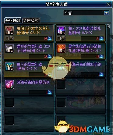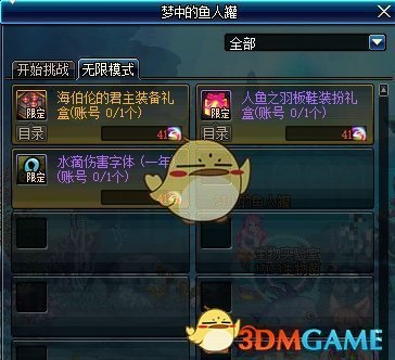 累计18天通关小游戏后,可开启无限模式,每天可从无限模式获得10个材料-华丽人鱼的妄想,奖励有1件海伯伦、无属性且无法分解或合成的鞋子装扮(注意:和挑战模式的鞋子装扮名称不同)、1年的水滴伤害字体。