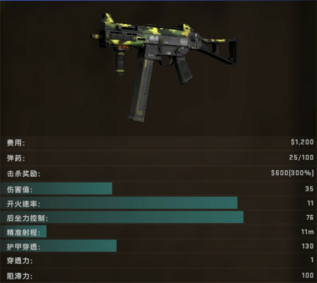 可以看到,ump的伤害值为35,非常高,甚至可以和一些步枪相提并论,而且由于是冲锋枪,有效射程比较短,弹道比较容易控制,这意味着在近距离压枪,甚至是移动射击,效果会十分可观。而且上文说过,价格十分便宜,只需要1200,就能买到伤害几乎可以和M4A4持平的武器,性价比可以说是很高了。