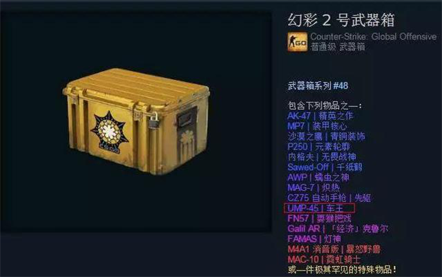 首先,“车王”的本名叫做UMP-45(下文称ump),是游戏中的一把微型冲锋枪。而“车王”这个名字来源于曾经的“幻彩2”武器箱中ump的皮肤饰品,因其作为开箱的副产品,再加上皮肤本身也挺好看,普及率高,在加上各路比赛解说的推波助澜,久而久之,“车王”自然而然地成为了所有ump的又一个别名。