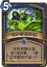 哈加莎的阴谋,5费全场打一,每回合升级。标准中萨满的五费解场法术只有火山喷发,全场15点伤害随机释放,但是要过载,和这张卡相比不需要过载,但是摸到的时机就很关键,比如对阵快攻可以起手就留,没回合升级,等需要的时候释放,但是如果准时摸到,或者是后期摸到,再等升级的话就太慢了,也是这张卡的弊端,我觉得这是一张看环境的卡,快攻多的话可以考虑带一张,并且起手有的话也可以留一下,因为我并不知道这张卡升级的最高形态是什么样子,我就不多说了,看实际测评。