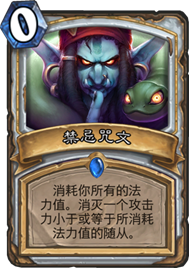 牧师的这张禁忌咒文,有点像法师的禁忌烈焰,好消息牧师不用怕四攻爹了,各种形态的牧师都可以尝试带一张。这张卡主要还是比较灵活,可以按攻击解怪,但是如果真的是攻击力很高并且威胁到我们的怪,我们也可以用灭解掉,如果是像新卡卡雷苟斯一样的话我们可以用这张卡,所以我觉得这张卡在新版本的局限性还是很大的,我觉得实战的效果并不会很好。