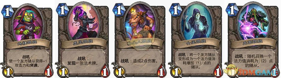 新版本的跟班卡,除了这个地精跟班的稍微弱一点,别的跟班的效果都是相当强的,免费的卡牌,以及随机的效果,让这些卡可以创造无限的可能性,而这些可能性就是赢得比赛的关键。