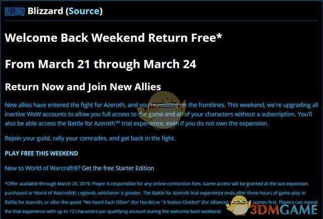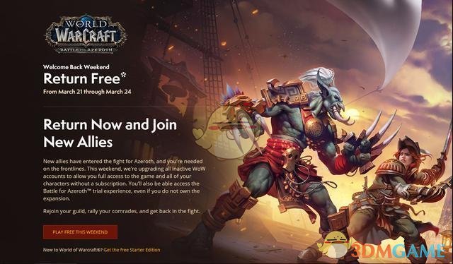 为了配合魔兽世界8.1.5版本上线,暴雪最近的动作有点多,美服的官网上可以发现这样一条消息。(Return Now and Join New Allies)魔兽世界将会在本周四开启免费体验四天的活动,这个是针对所有月卡耗尽的账户,不需要冲卡就可以免费玩一个周末。