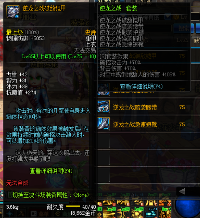 第一套要说的就是一套名为逆龙之战的套装,这套装扮的年纪比安徒恩还要老,但是很少有玩家对其了解。我们来看看套装属性,破招伤害+70%,背击伤害+70%,对空中或者倒地的敌人伤害+105%,看这属性,真是粗暴的不得了。动不动就增加70%,甚至还有105%的伤害,现在有哪套装备可以给你增加70%的伤害的?