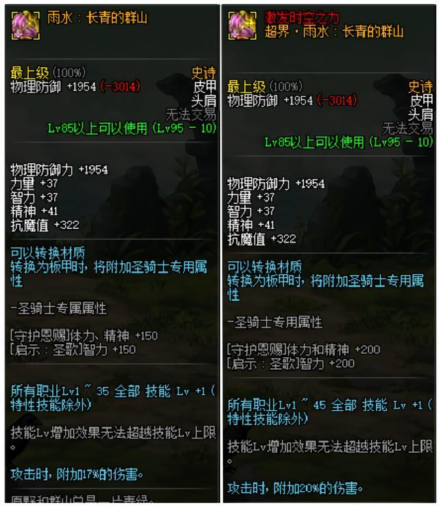 泰波尔斯皮甲头肩-雨水:长青的群山,未升级前的属性是增加1级全职业1到35级的技能等级,17%的白字附加伤害;升级超界后的属性是增加1级全职业1到45级的技能等级,20%的白字附加伤害。