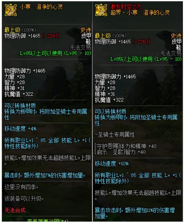 泰波尔斯皮甲鞋子-小寒:澄净的心灵,未升级前的属性是增加1级全职业1到85级技能等级,7%的追加爆伤;升级超界后属性是增加1级全职业1到85级技能等级,11%的追加爆伤。