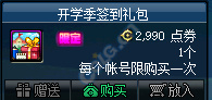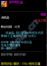 每个账号限购买1次,只能使用点券购买,开启后可获得1个[新学期礼盒](2990欢乐代币券+王者契约礼包10天)&10个[每日签到礼盒](150欢乐代币券,每天只能使用1个),累积可获得4490欢乐代币券,欢乐代币券将于2018年9月17日更新维护后统一删除