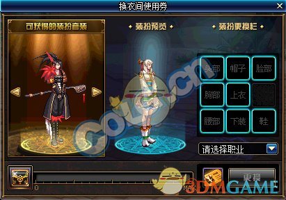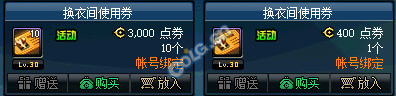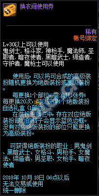 可以将可合成的高级装扮随机更换为绝版装扮(节日时装)&其他高级装扮,每更换1个部位消耗1张[换衣间使用券],每更换20次,可以获得1个绝版装扮自选礼盒(1部位)——金兔赐福套;仅鬼剑士(男)、神枪手(男/女)、格斗家(女)、魔法师(女)、暗夜使者可以使用获得装扮