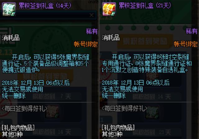 其他累计签到的奖励第14天有5张魔界裂缝通行证和5个装备品级调整箱,而我更期待的是这5个锻造炉,看看能不能让我锻造7的武器成功上8。