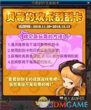 活动时间是2018年11月29日到12月13日,我们每天通关推荐的地下城可以获得刮刮卡,通关2次地下城会获得1次机会,每天。并且也能在贝奇商店购买这个刮刮卡,一次150万一张,目前没有看到有数量限制,如果没有限制,那么这一波土豪玩家可以考虑用金币购买了,特等奖每周都能开出来吧,看来金币的价格真的要稳定在目前1:35左右了。不过大家看到获得所有奖励后会获得特别奖,意味着我们特等奖是获得其他奖励后必定获得的,这样我们就需要获得1到4等奖,然后就能获得这个特别奖的奖励了,看起来好像变得更人性化了一些吧。刮奖板每周四更新一次,活动总共2周,奖励大家最多获得2份。