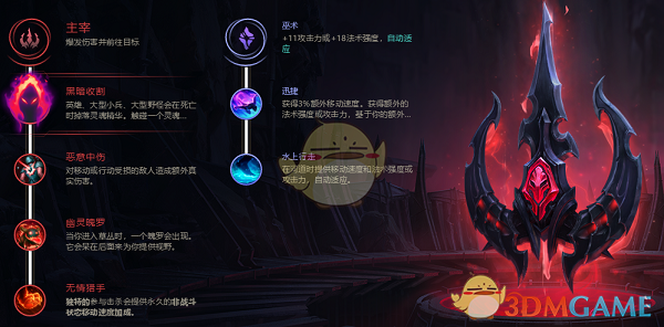 黑暗收割:妮蔻的伤害与爆发极高,而且伪装GANK成功率较高,可以帮助妮蔻快速的叠加黑暗收割层数。