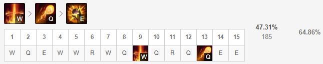 主W副Q,有R点R,W技能是主要的消耗技能,还可以线上清兵,而Q技能则是关键的控制技能。