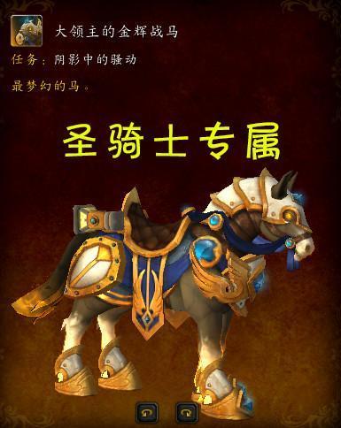 缰绳有四个,任务完成给一个,其他三个也是专精巅峰奖励的。战驴的样子还是不错的,虽然圣骑的马坐骑也不少,不过这个还是非常酷炫的,经常见到有骑的大领主。