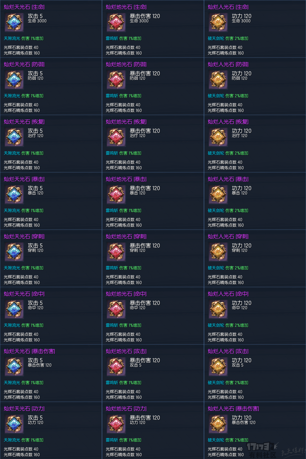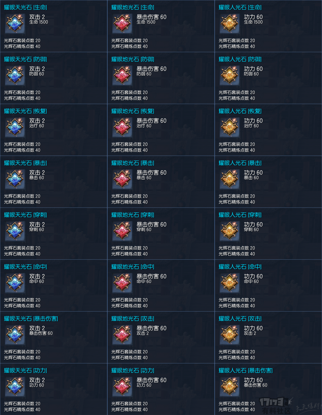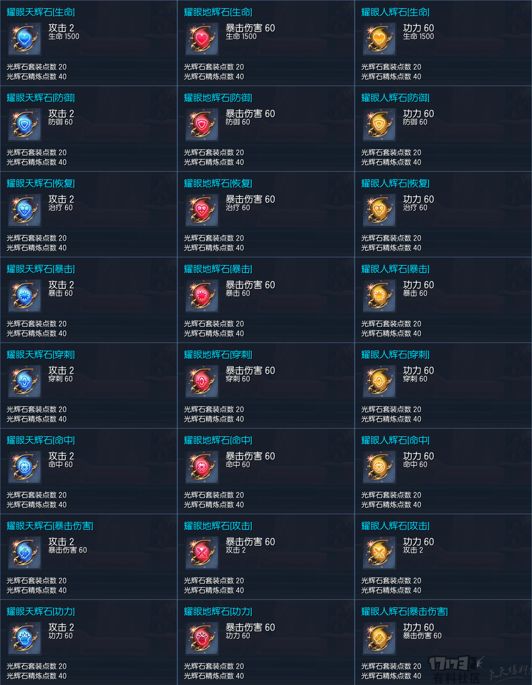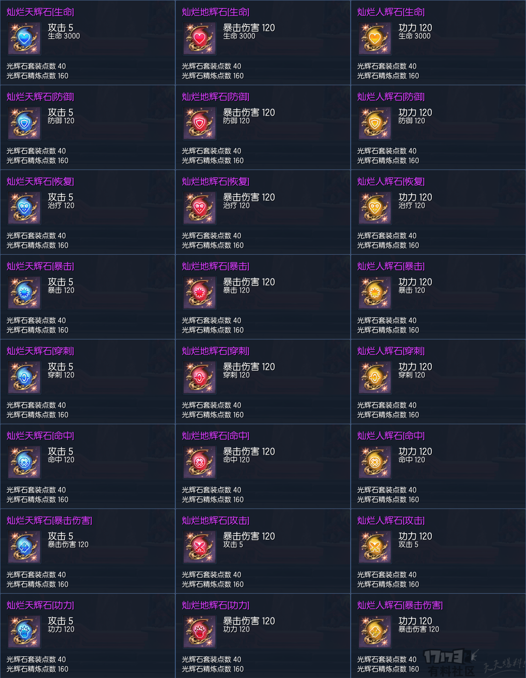 优化光辉石属性(耀眼/灿烂/辉煌阶段属性图预览,由电六小可爱“Nonely白”提供),
