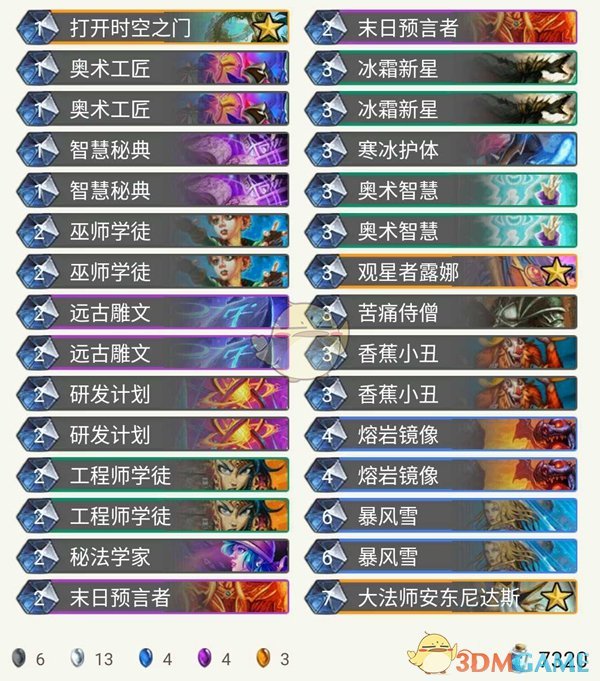 由于新版本法术猎的横行,导致天梯普遍降速,奇数贼,奇数骑几乎消失在了天梯中,这就给了无限火球法大放异彩的机会!新卡香蕉小丑的加入,极大的缩短了做任务的时间,新版本极快的过牌速度让无限火球法能够在十费之前就把牌库过穿,所以我们不怕Key牌沉底!冰环末日和暴风雪能够帮我们拖回合数争取到做完任务和凑齐Key牌的时间。