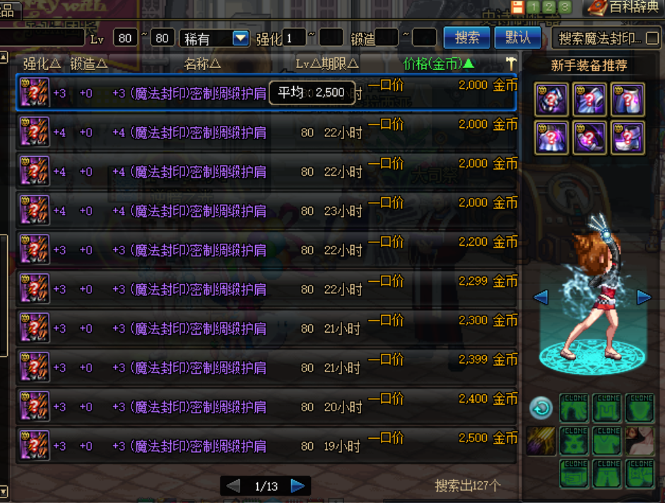 第一步,打开你的拍卖行,然后选择80级以上的装备,任何部位都可以,然后品级选择稀有,也就是假紫装备,强化等级选择1以上的。为什么要选择1以上的,因为便宜呀,没有强化的会摆在最前面,所以卖的都比较贵,所以选择强化1以上会比较便宜,然后最后再点一下价格排比,最便宜的就会显现在大家的面前啦。总之什么装备都会有卖的便宜的,这边小编选择的是80级的布甲,一个2000金币,买就对了。