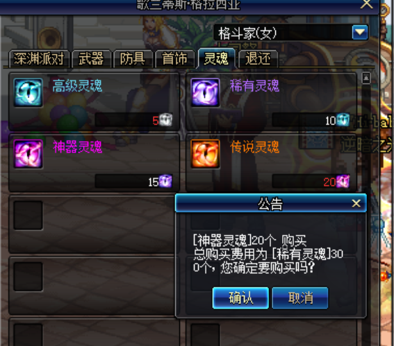 接下来就是第三步了,找到歌兰蒂斯,我们可以看到,低级灵魂是可以购买高级灵魂的。兑换一个传说灵魂需要20个神器灵魂,兑换一个神器灵魂需要15个稀有灵魂。换算一下,300个稀有灵魂就可以兑换一个传说灵魂了。最后算算成本,一个假紫可以分解出4个稀有灵魂,300个稀有灵魂就需要分解75件假紫了,一件假紫2000金币,75件就是15万了,所以15万就可以购买到一个传说灵魂,比直接购买传说分解要便宜很多。唯一的弊端就是太麻烦了,需要购买很多的假紫装备,但是谁叫我们穷呢,都是被逼出来的~