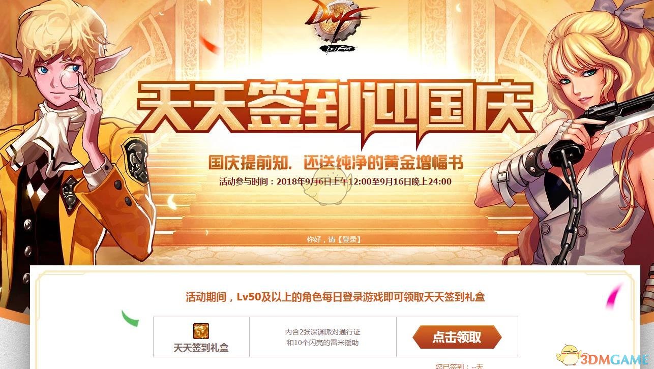 DNF9月6日推出了一大批活动,,天天签到迎国庆正是当中之一,玩家只要签到就可以领取丰富奖品。那么该活动签到地址在哪里呢?领取奖励又是什么?小编下面就为大家DNF9月天天签到迎国庆活动介绍,一起来看看把。
