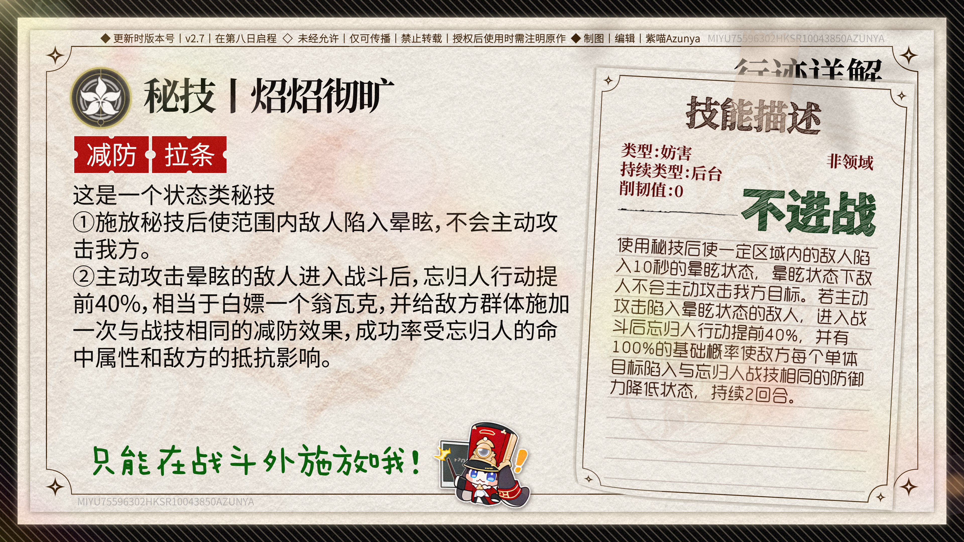 ①施放秘技后使范围内敌人陷入晕眩,不会主动攻击我方。