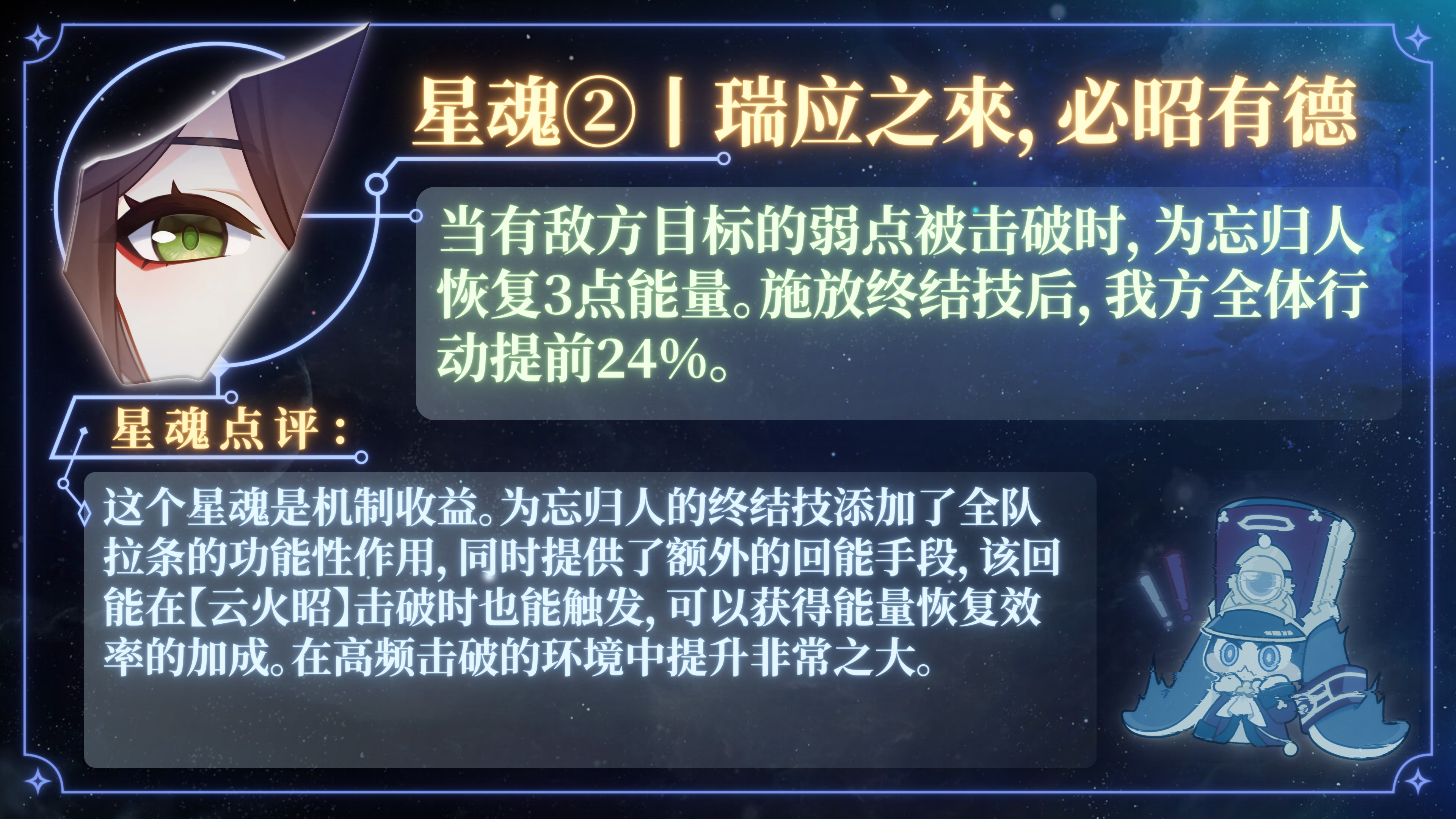这个星魂是机制收益。为忘归人的终结技添加了全队拉条的功能性作用,同时提供了额外的回能手段,该回能在【云火昭】击破时也能触发,可以获得能量恢复效率的加成。在高频击破的环境中提升非常之大。