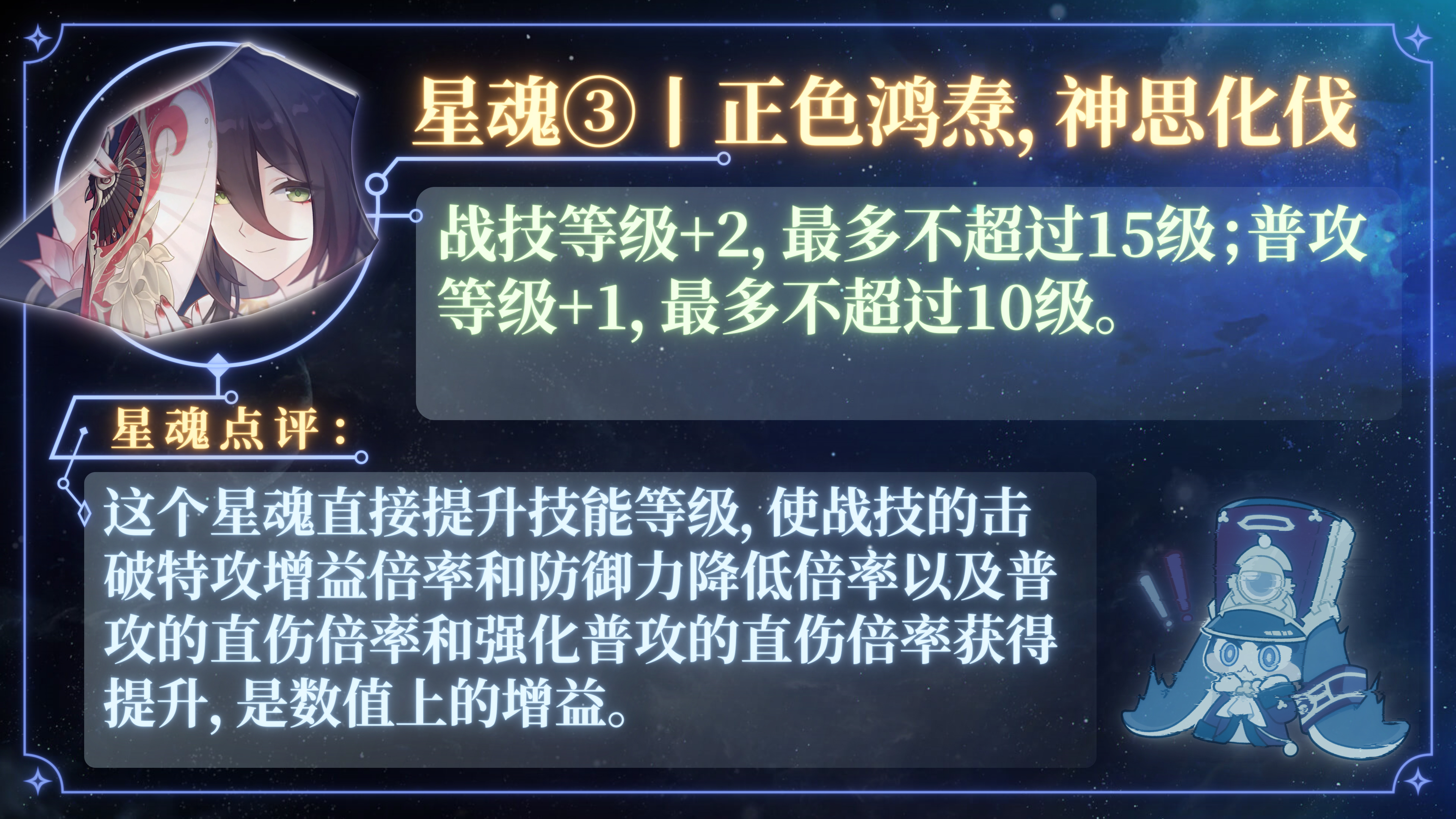 这个星魂直接提升技能等级,使战技的击破特攻增益倍率和防御力降低倍率以及普攻的直伤倍率和强化普攻的直伤倍率获得提升,是数值上的增益。