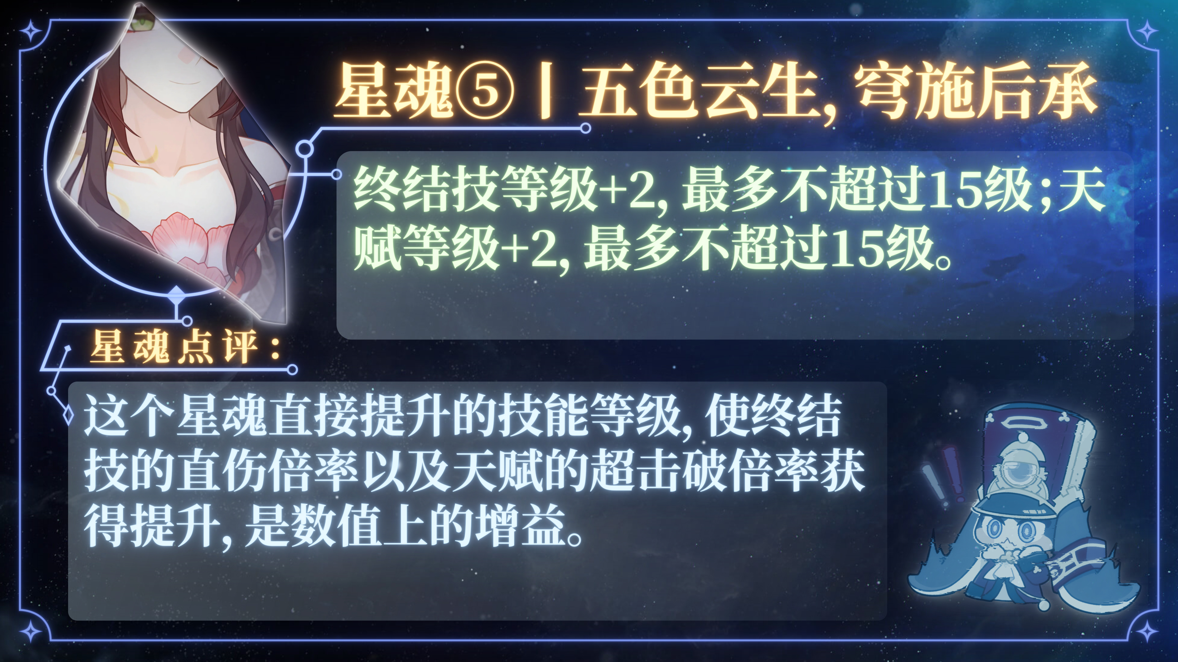 总结下来,0魂机制完整,完全够用。星魂1对击破队性价比还不错,可以考虑。后续的星魂属于有的话舒适度会有提升,但没有也行的级别,看个人预算补即可。