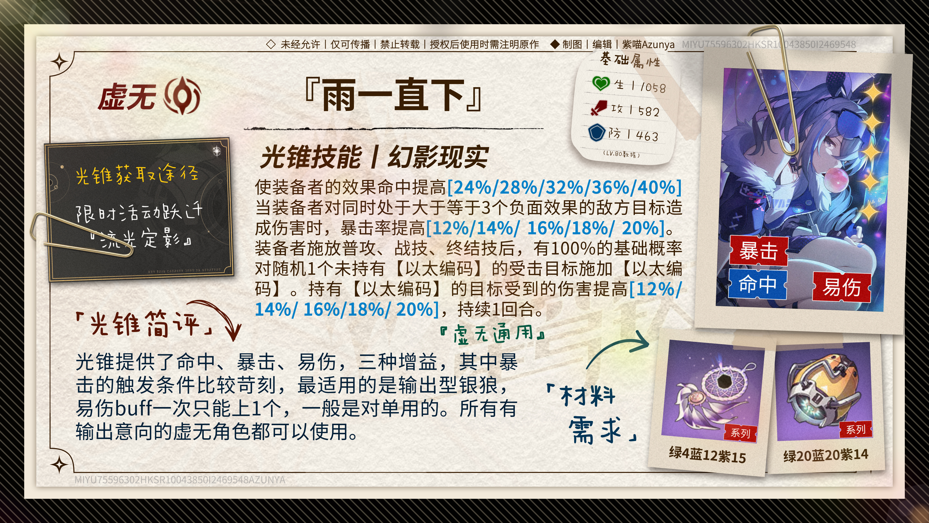 这个光锥提供减防效果,在减防达到100%之前是一个反稀释的增长曲线,配合忘归人自己的减防能力和队伍其他减防增益可以获得更大的收益,但基础概率较低,需要高命中或者高叠影来弥补。切记如果队伍减防已达到100%就不要带这个了。