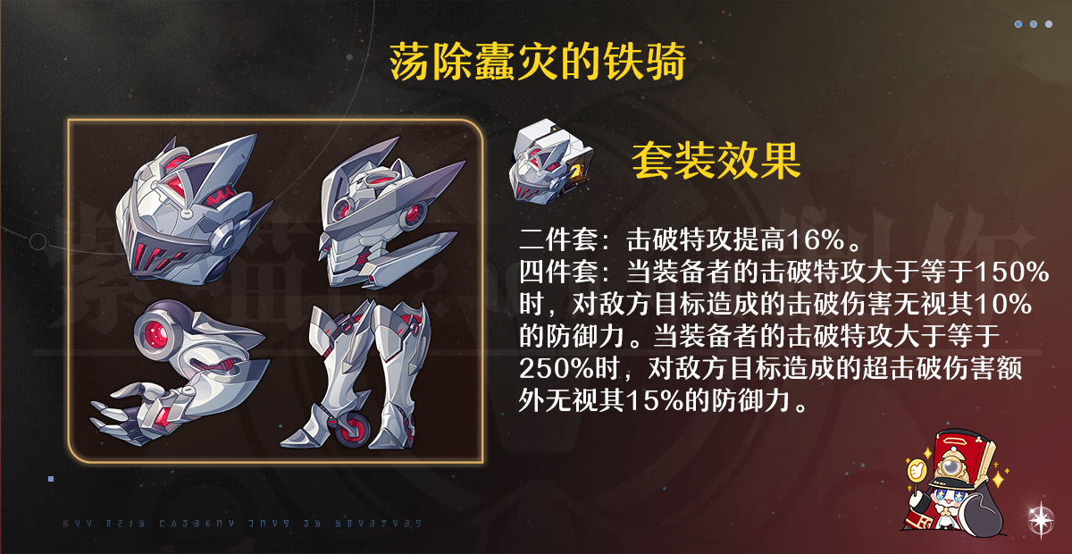 解析:这个套装常态提高击破特攻,当进战后速度达到145时可以额外再获得击破特攻。降低行迹要求的配装压力。只要配速达标,可以当做泛用选择,任何队伍都可以使用。